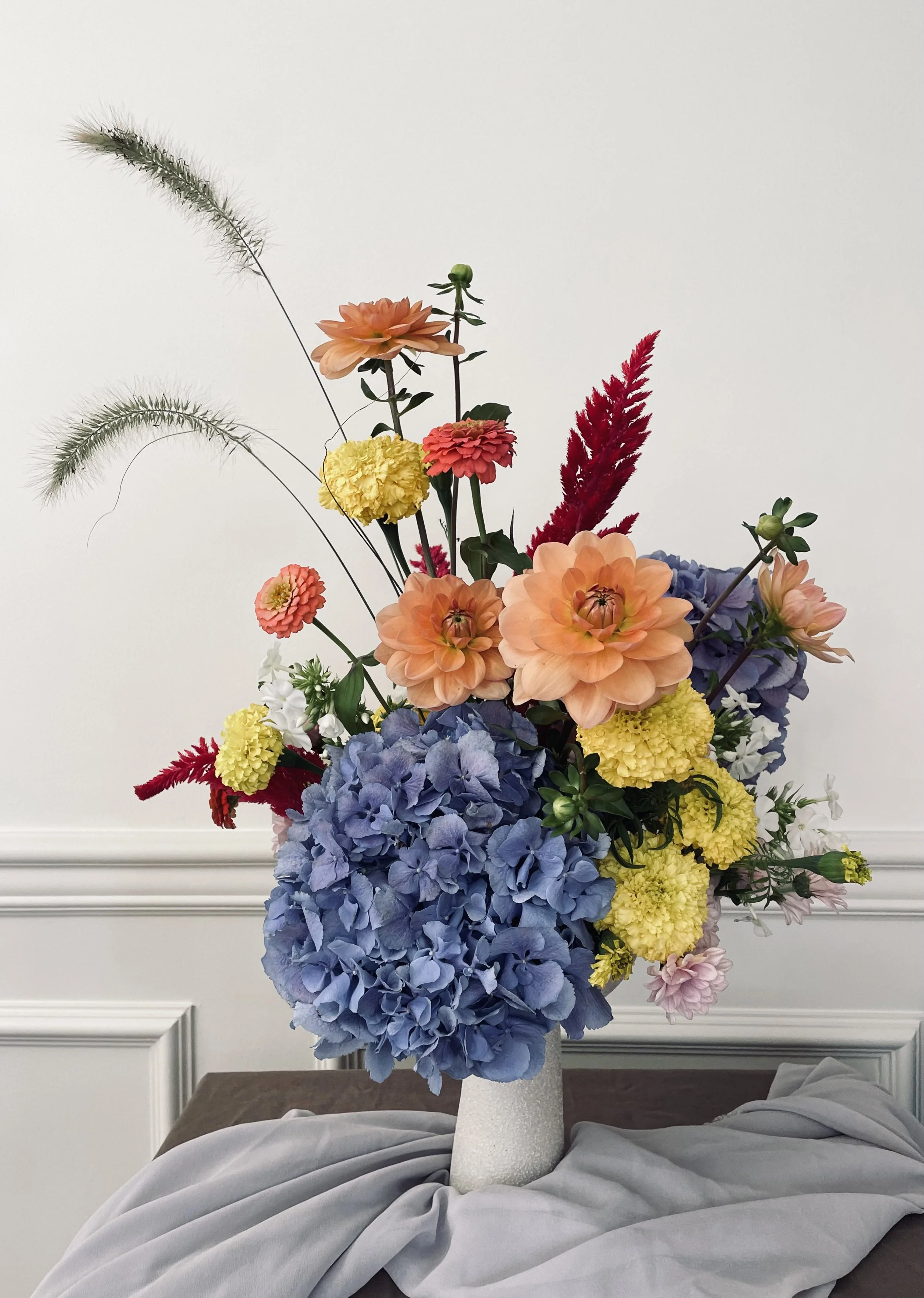 A colorful flower arrangement with blue hydrangeas, peach dahlias, yellow marigolds, red celosia, and other blooms in a tall white vase on a table draped with gray fabric, against a white wall background.