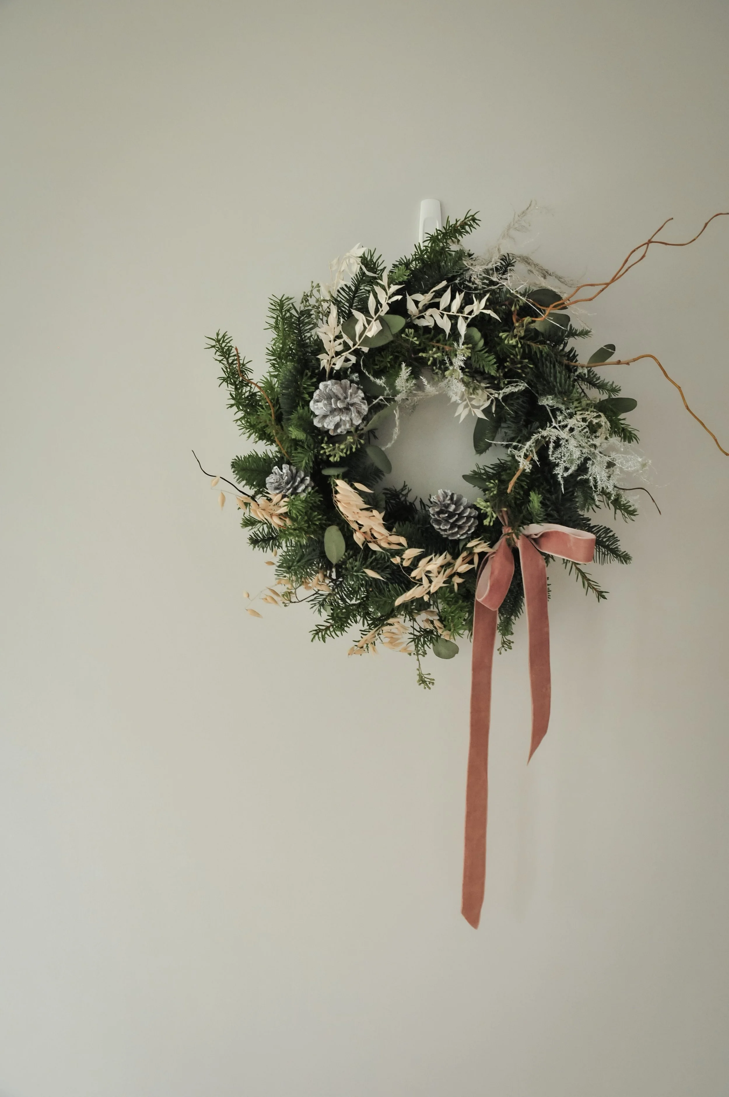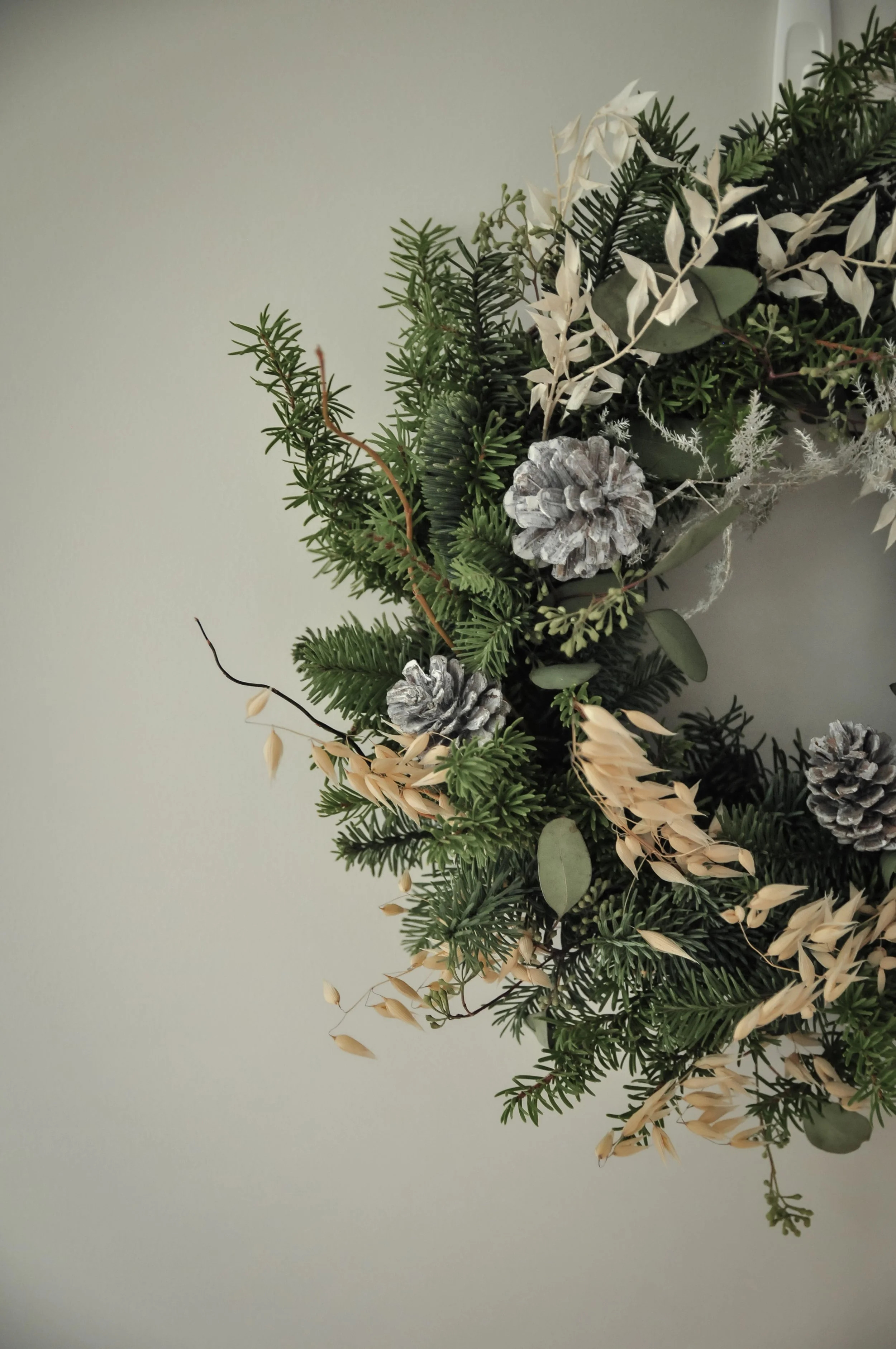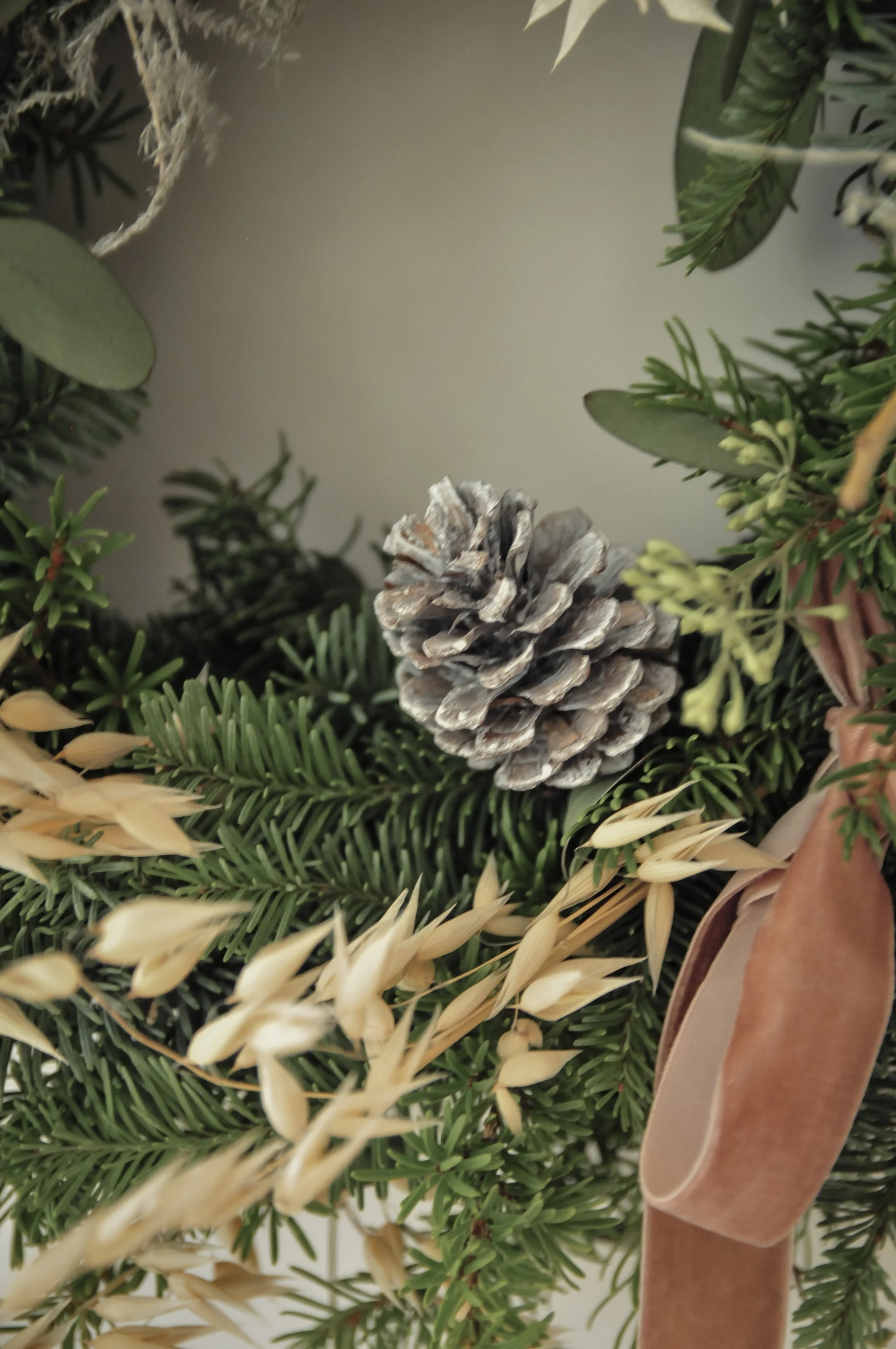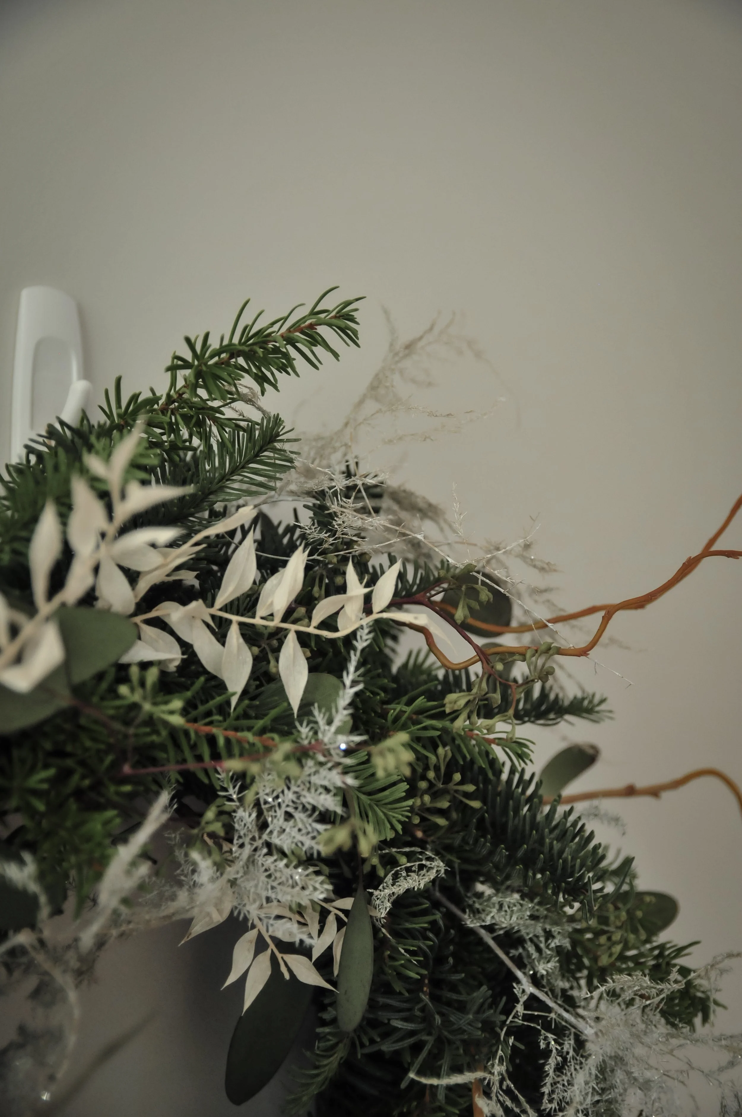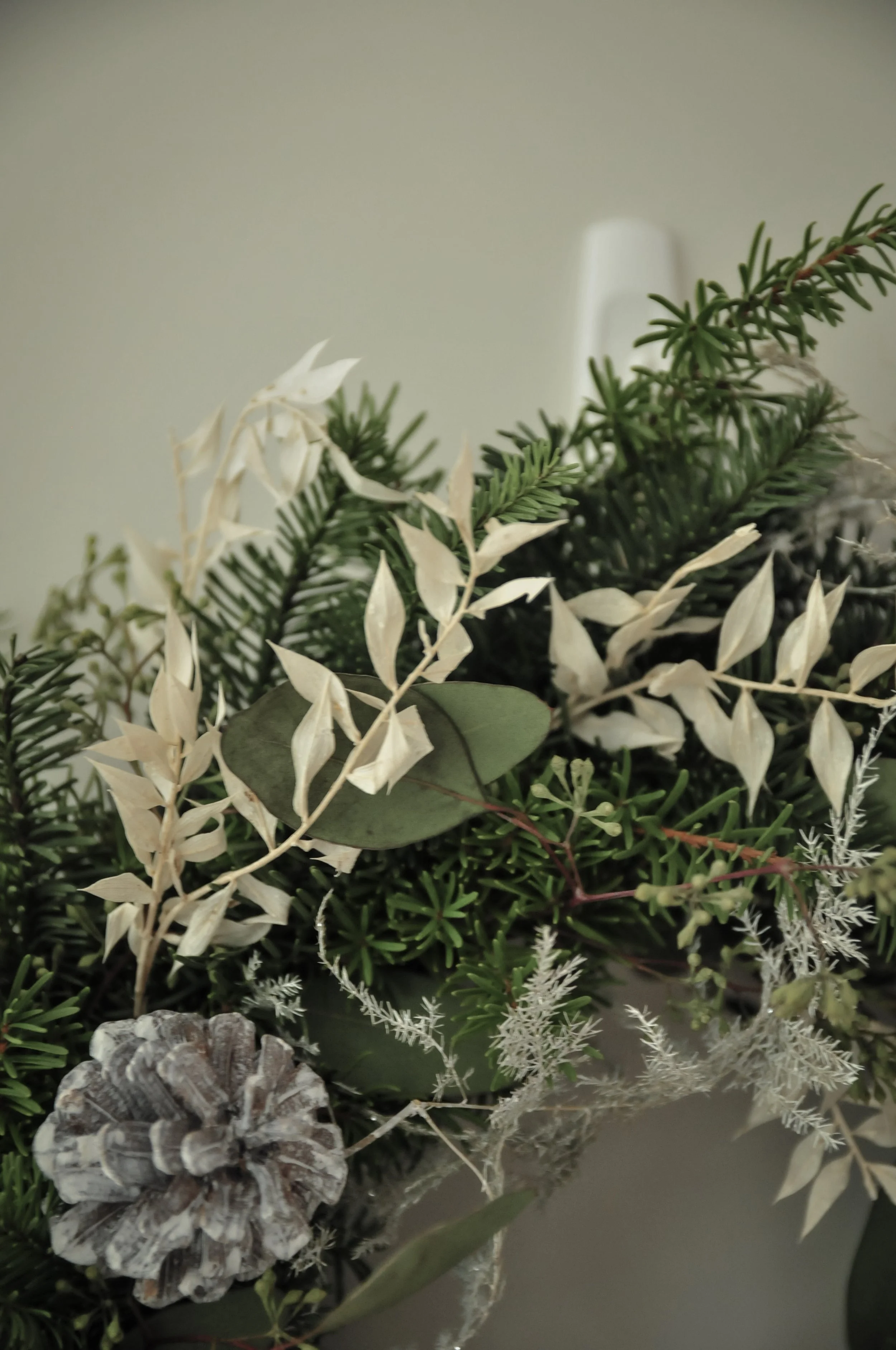 Elegant and serene, this wreath combines lush greeneries with pinecones, delicate white leaves, and curly willow for a modern winter look. Its soft, neutral tones bring a touch of sophistication to your holiday décor.