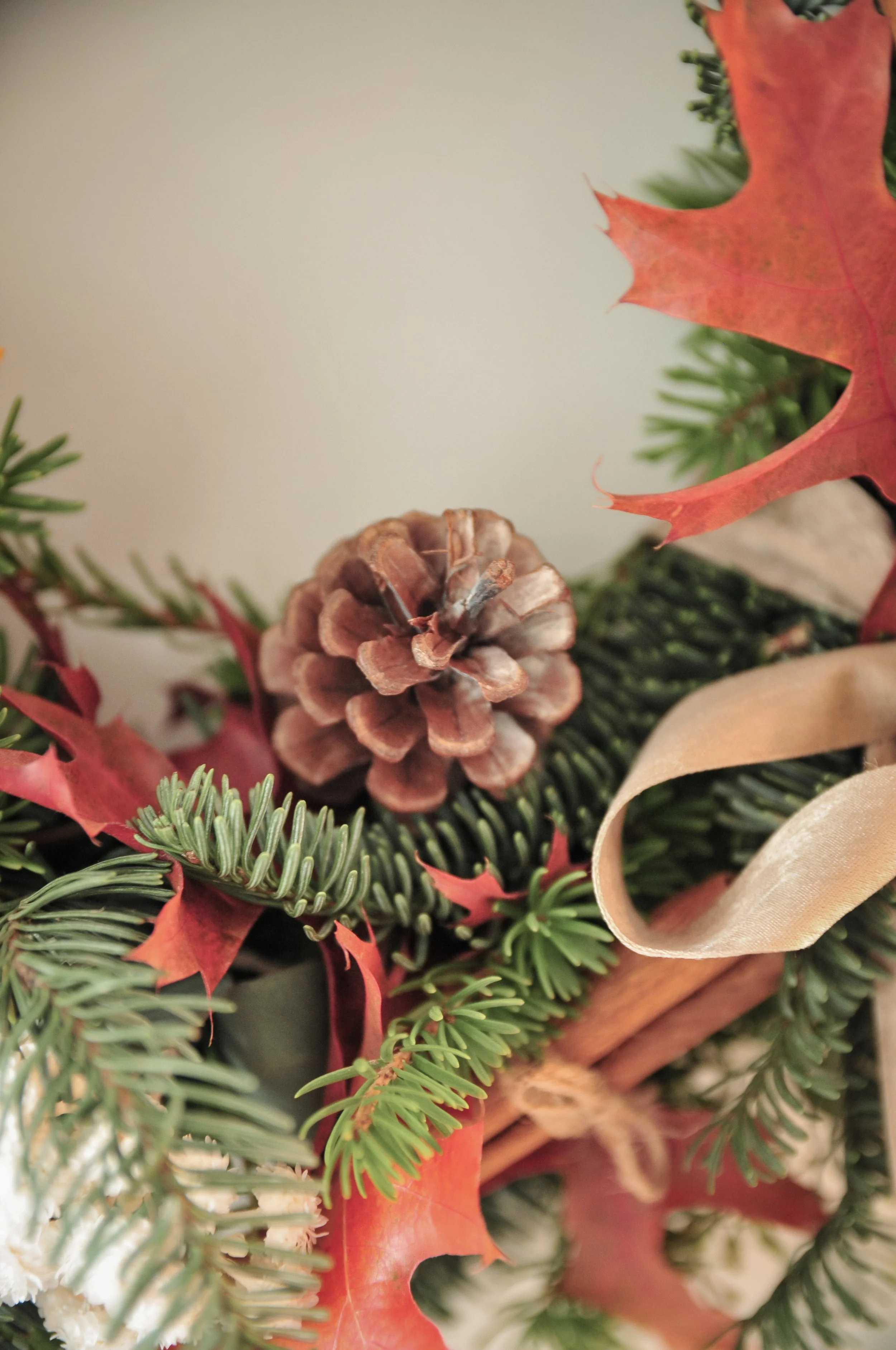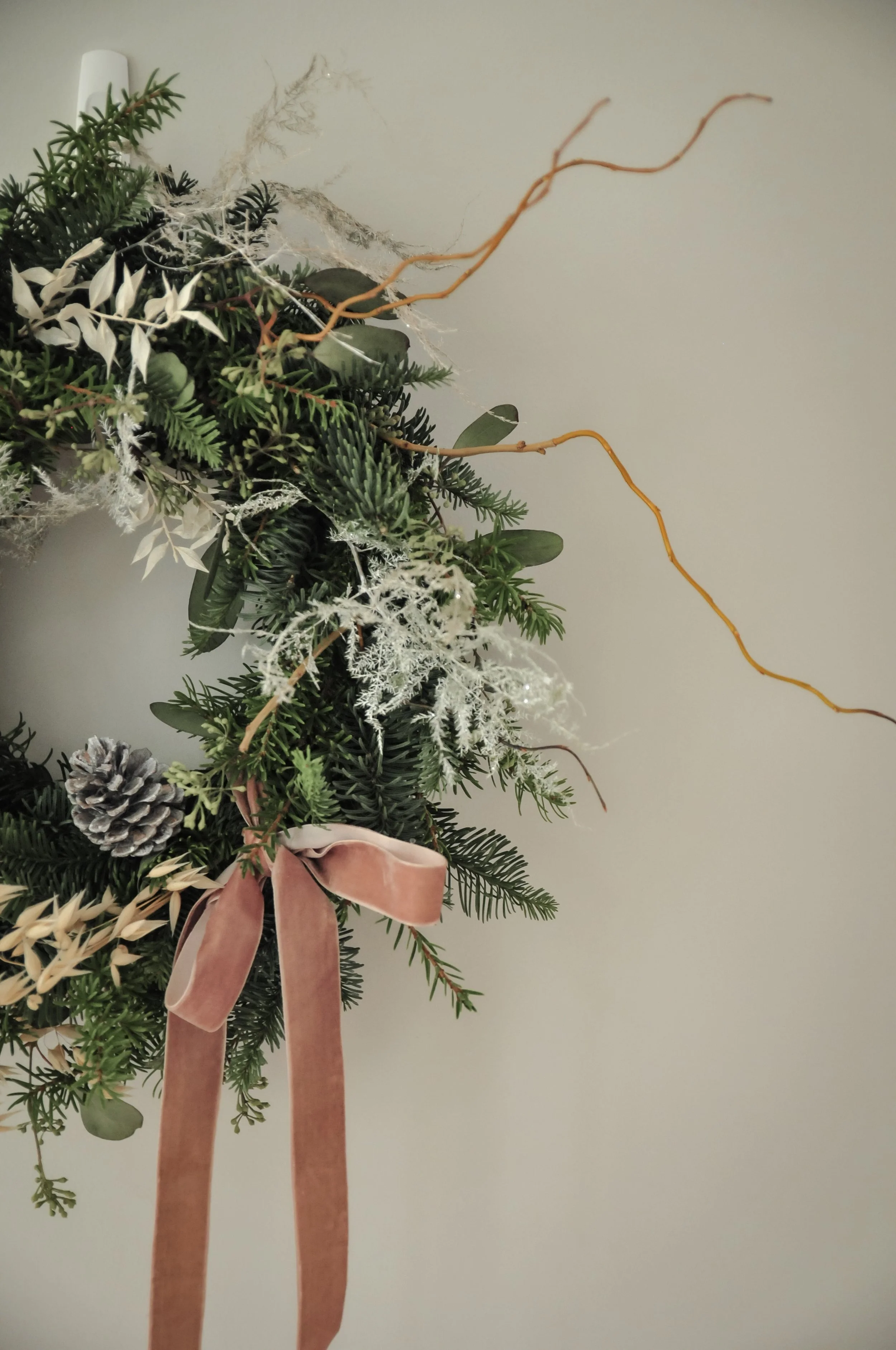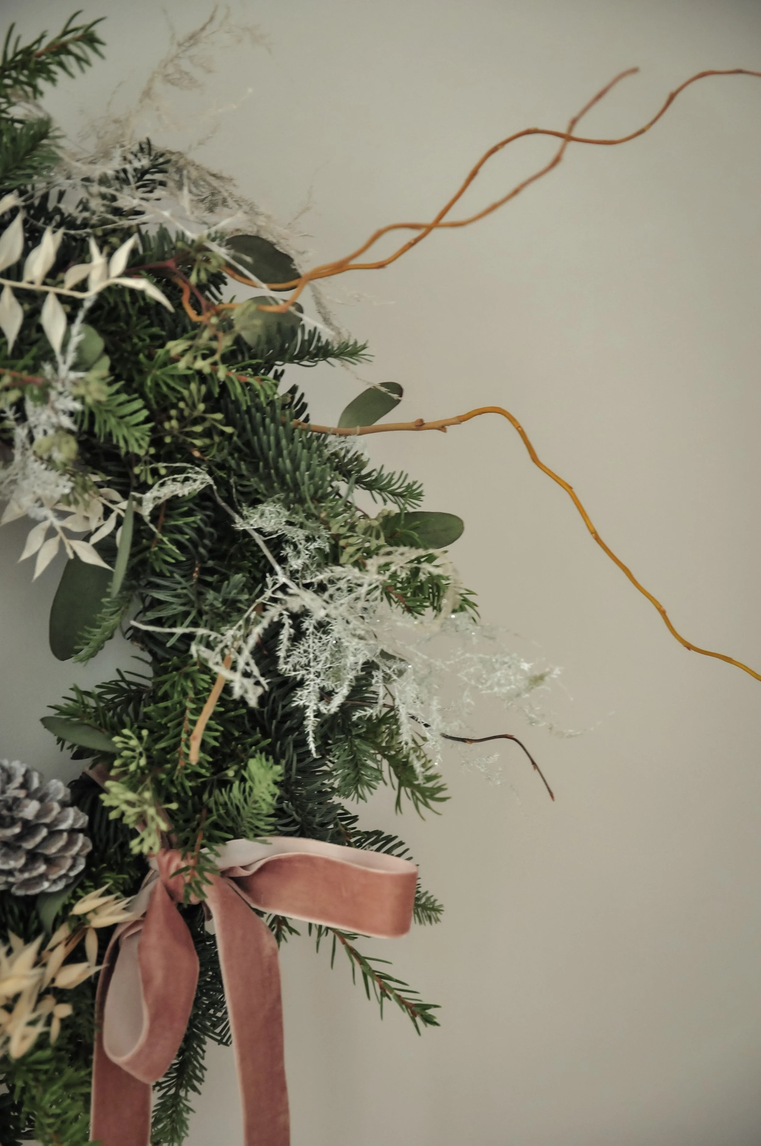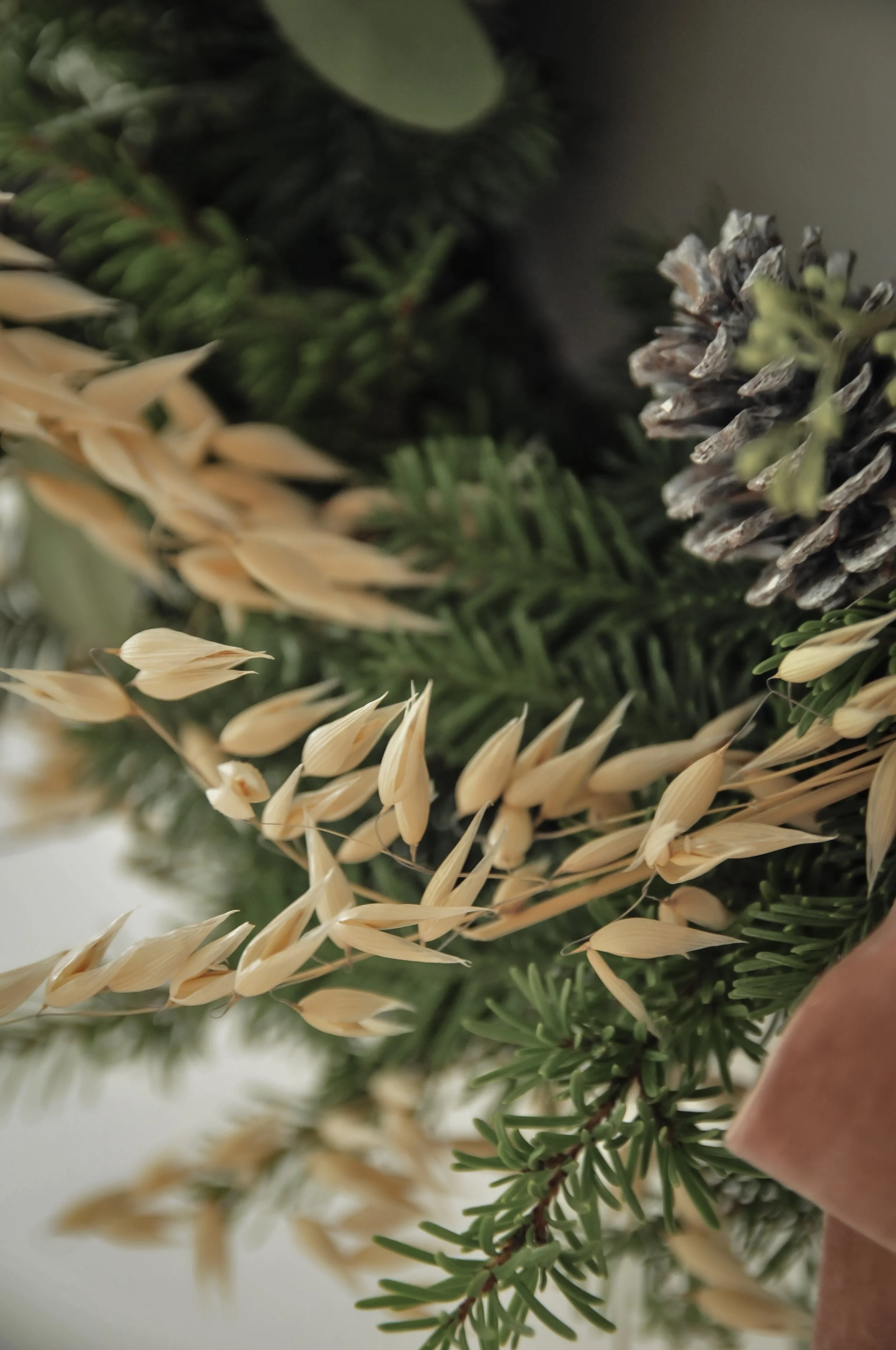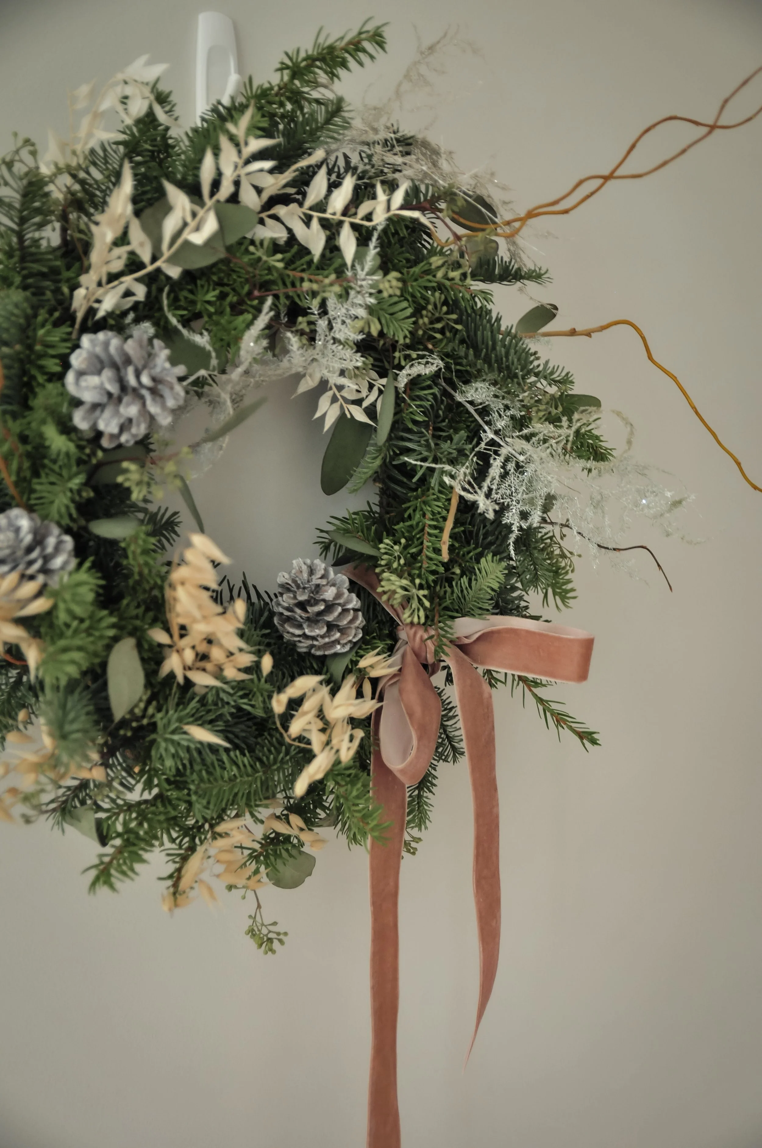 Elegant and serene, this wreath combines lush greeneries with pinecones, delicate white leaves, and curly willow for a modern winter look. Its soft, neutral tones bring a touch of sophistication to your holiday décor.