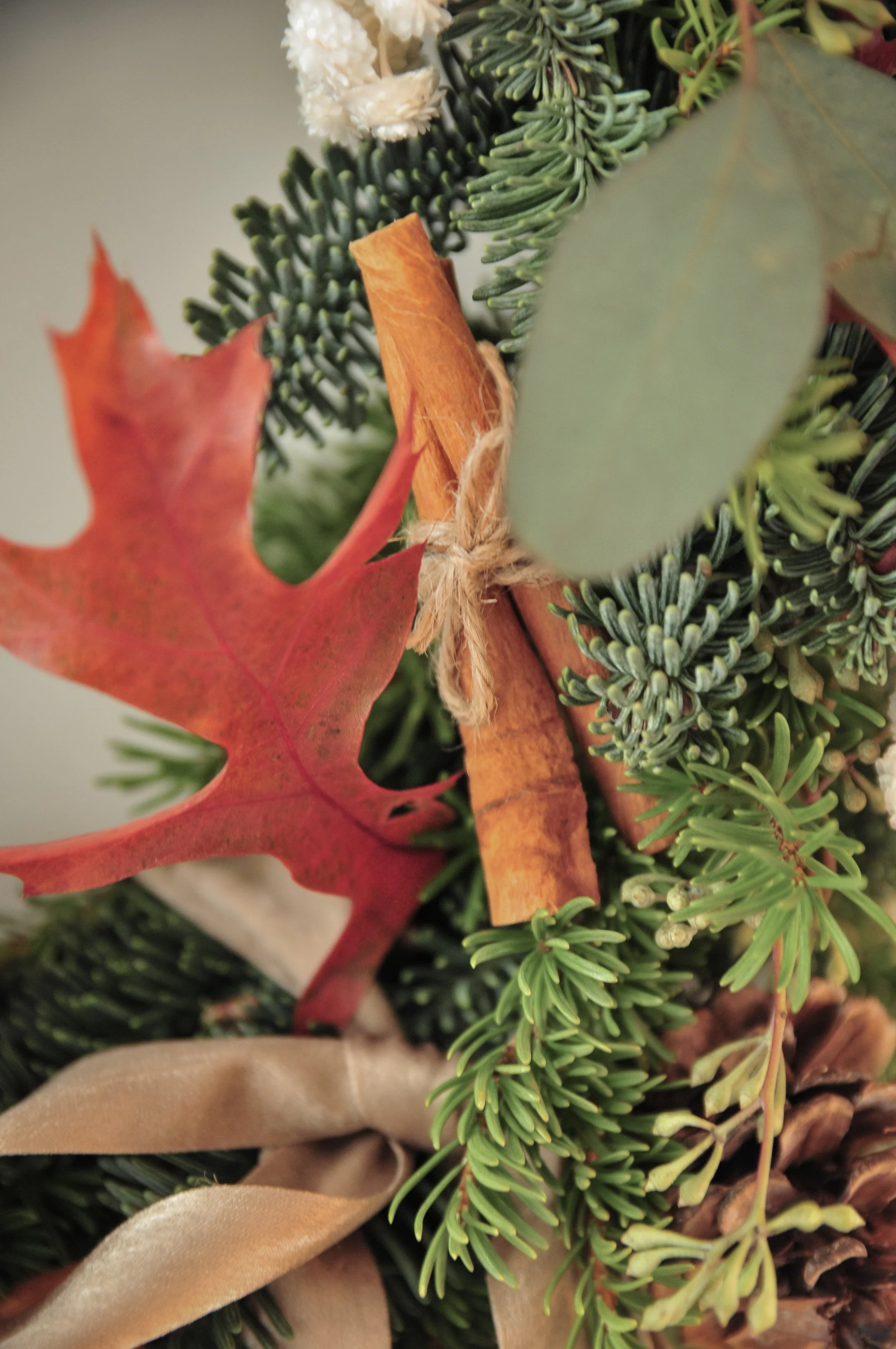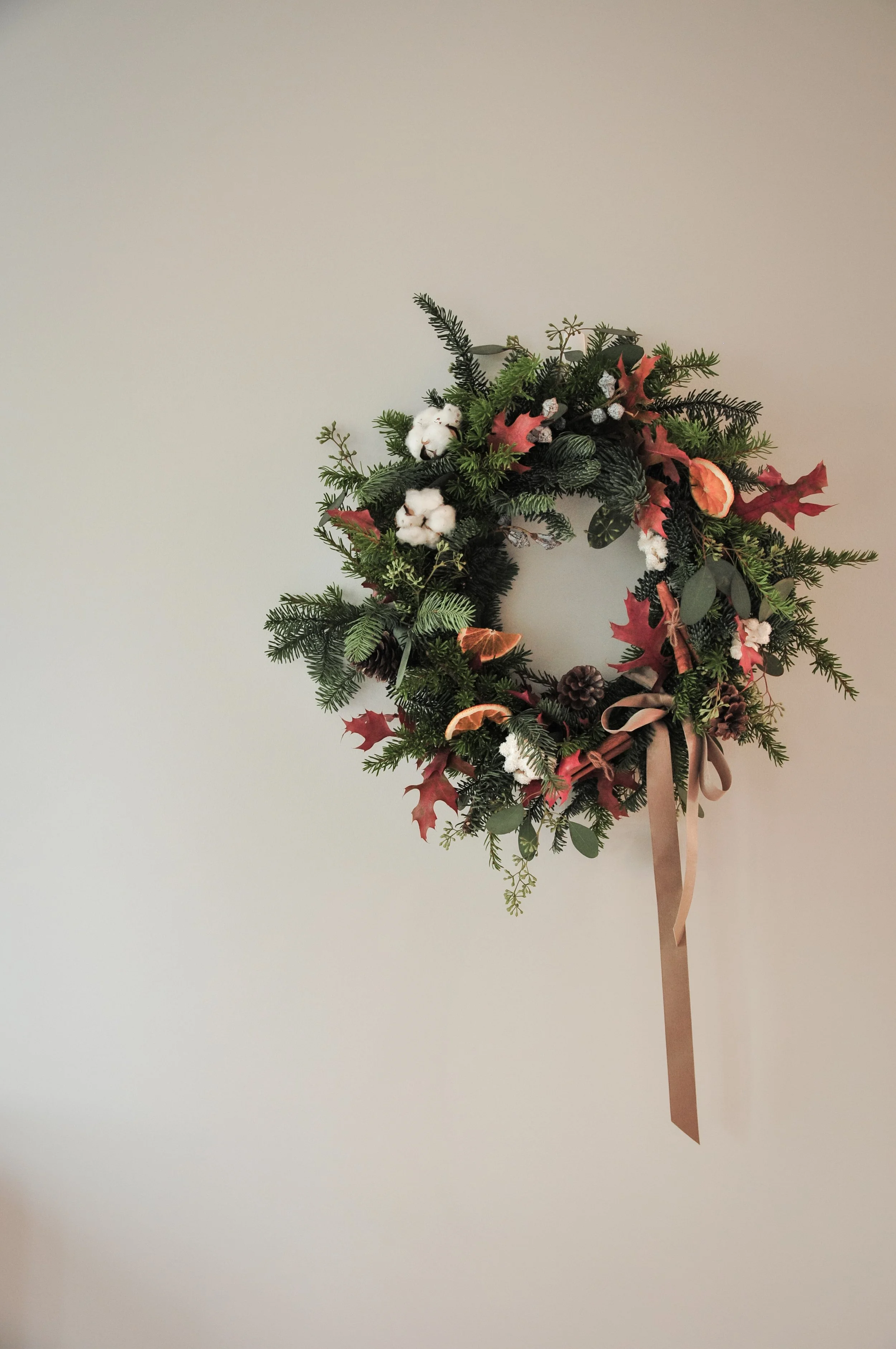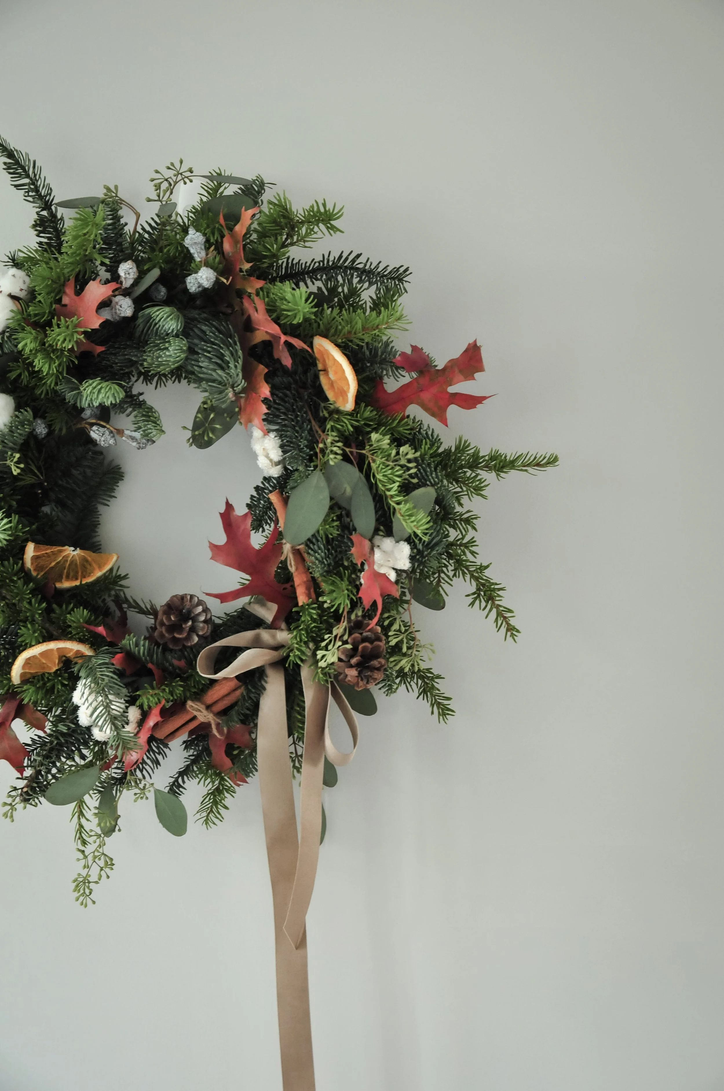 Designed with fragrant greeneries, dehydrated orange slices, cinnamon sticks and cotton. This wreath captures the nostalgic spirit of the season.