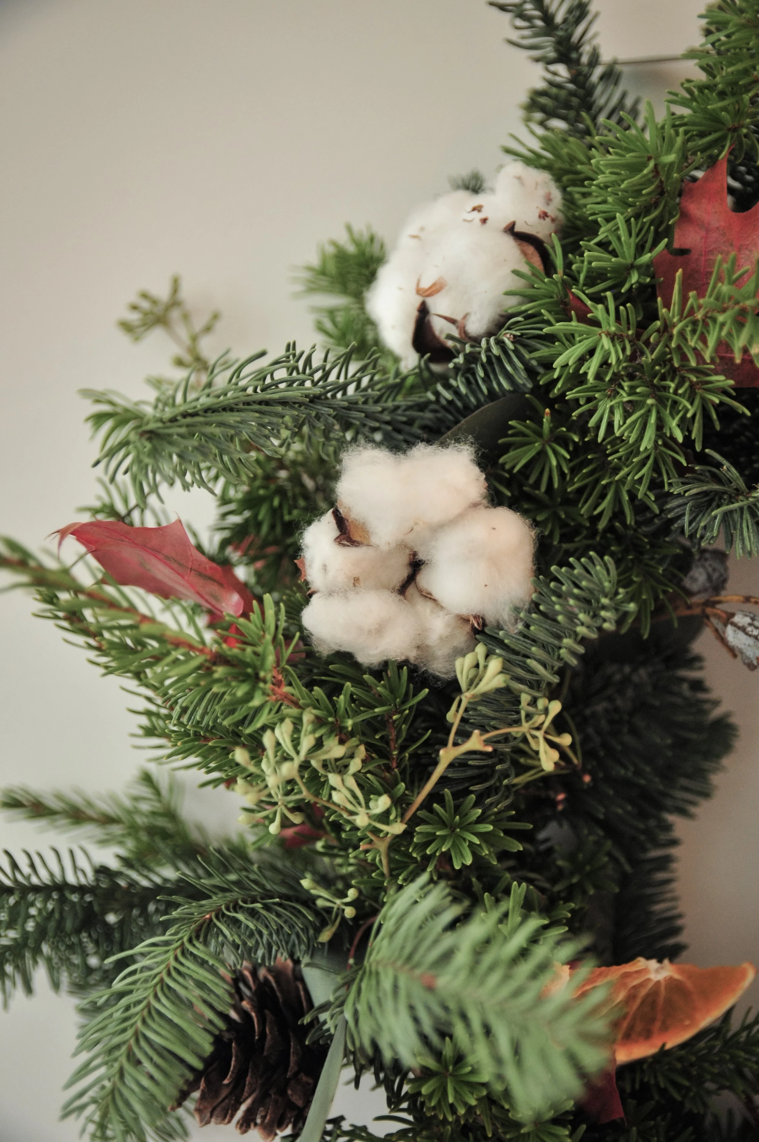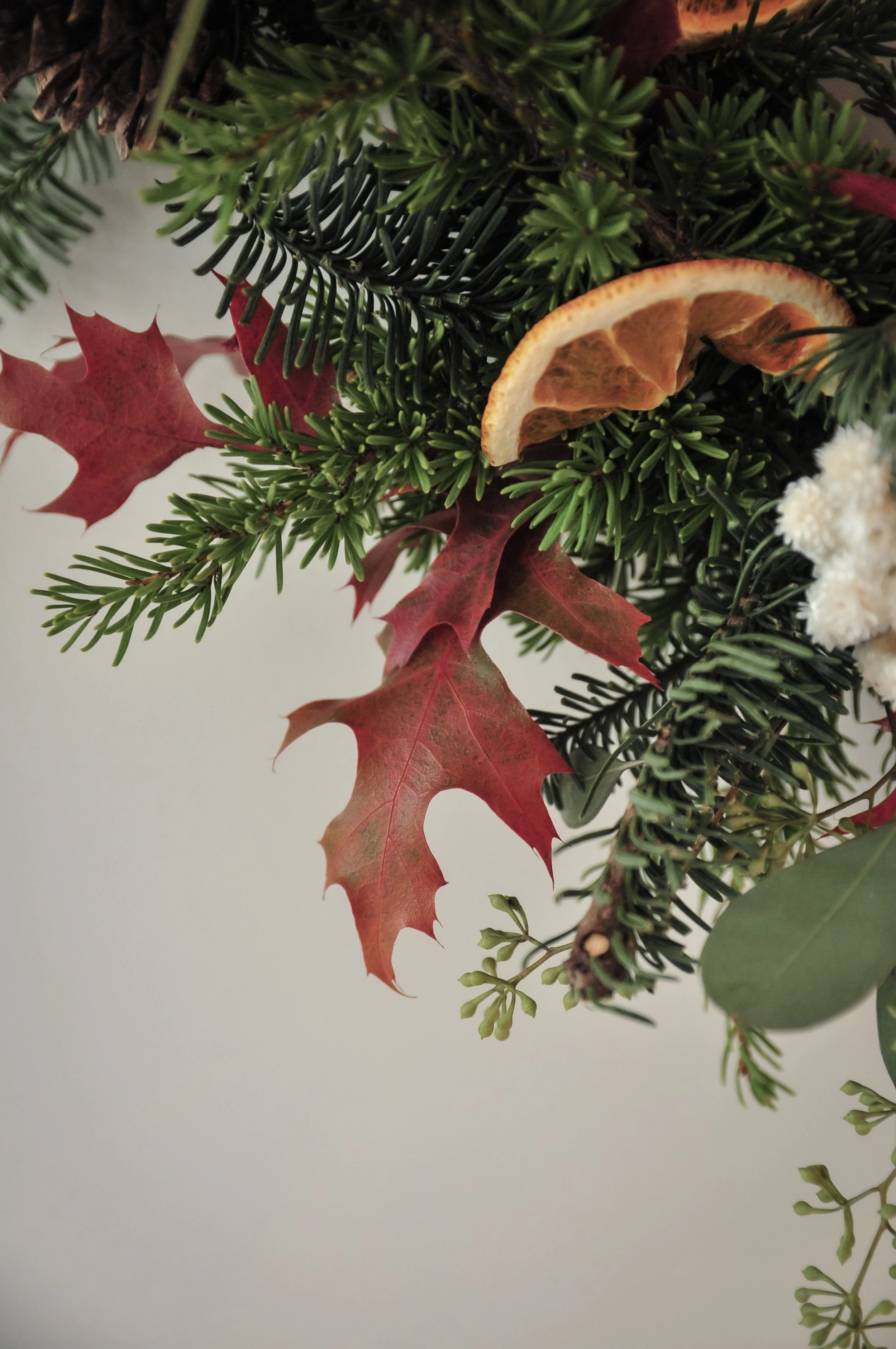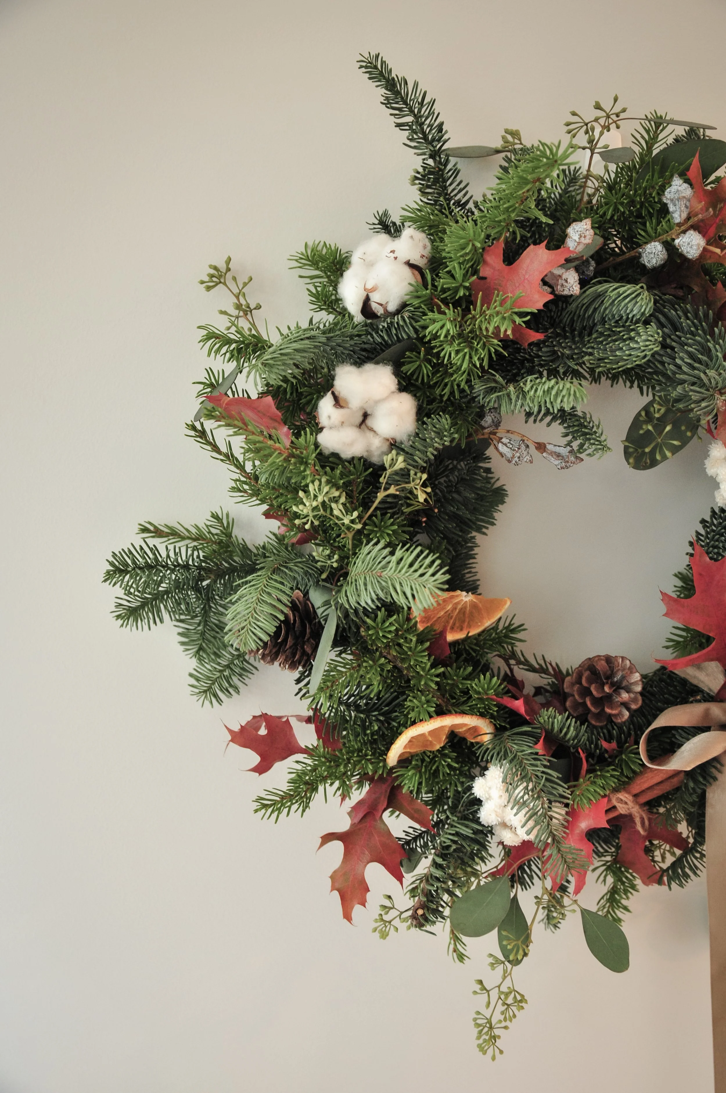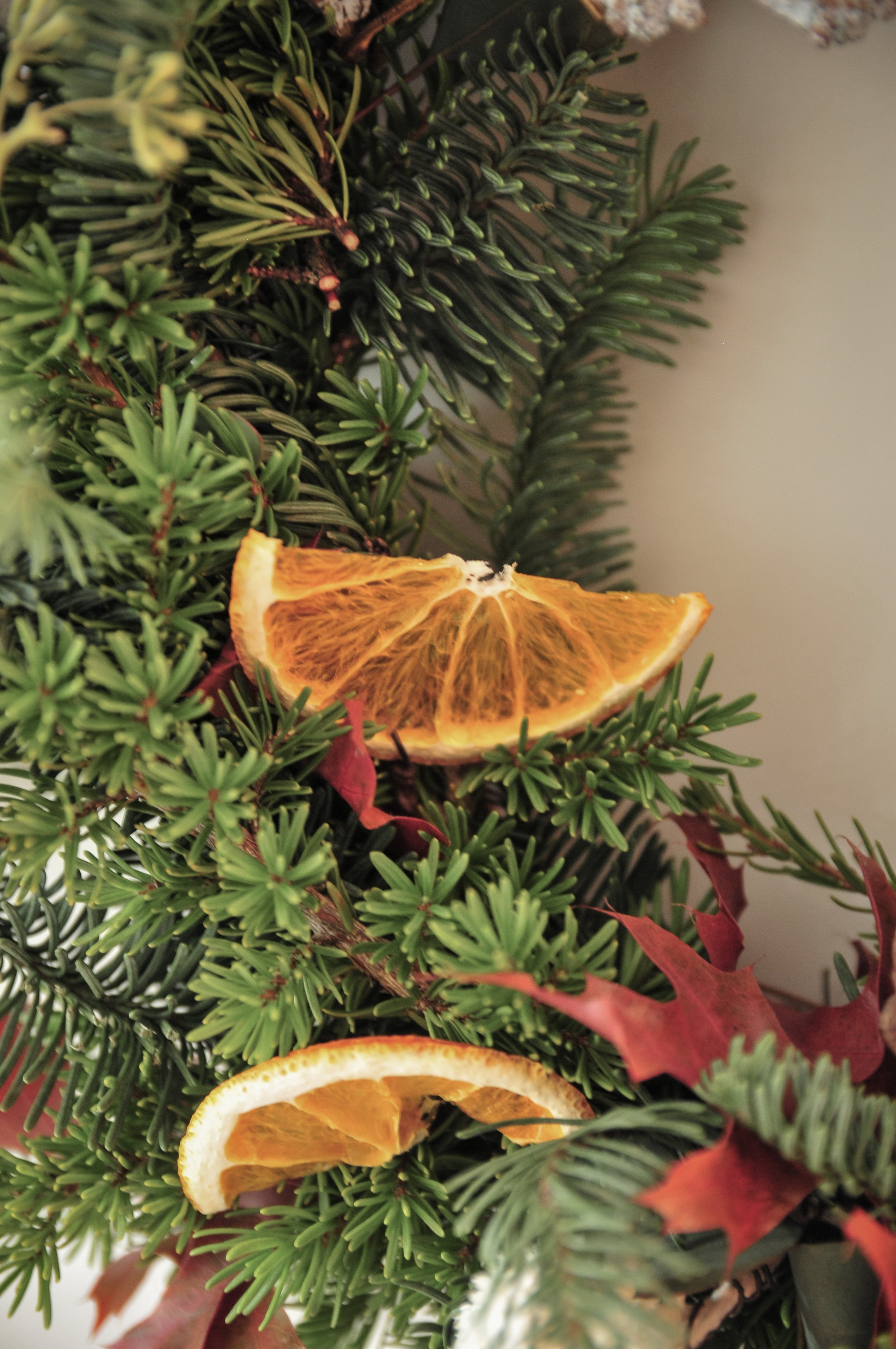 Designed with fragrant greeneries, dehydrated orange slices, cinnamon sticks and cotton. This wreath captures the nostalgic spirit of the season.